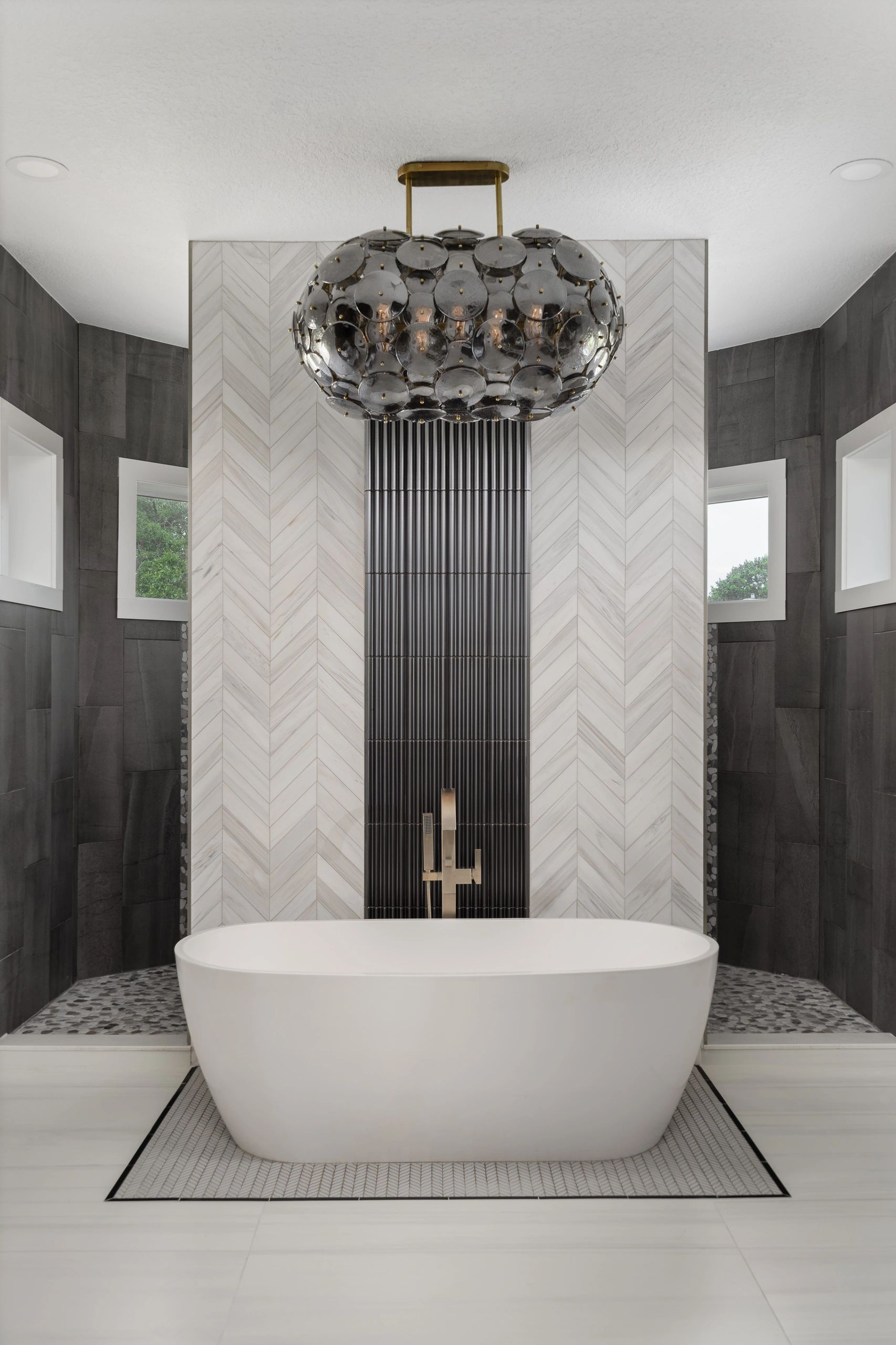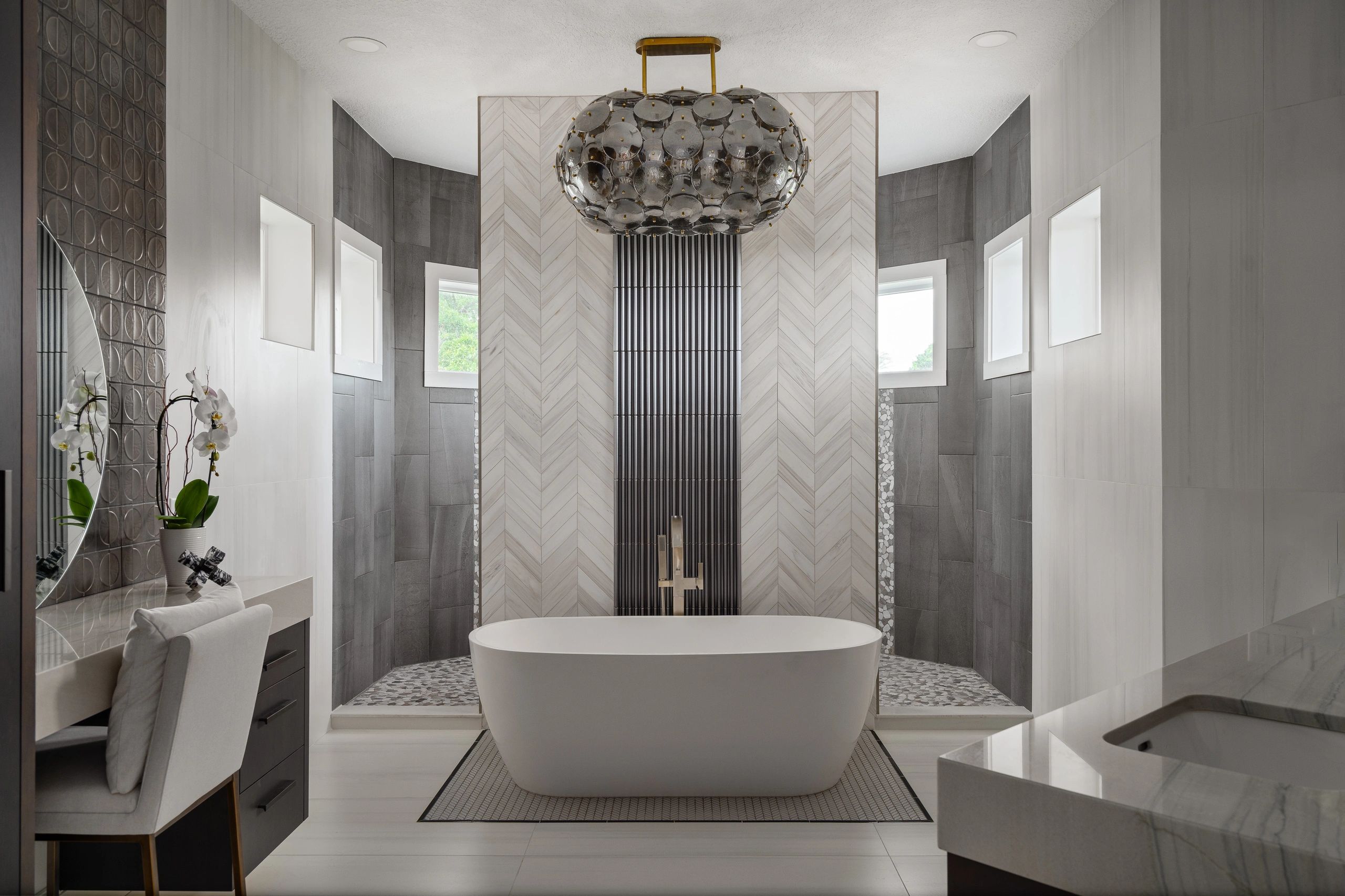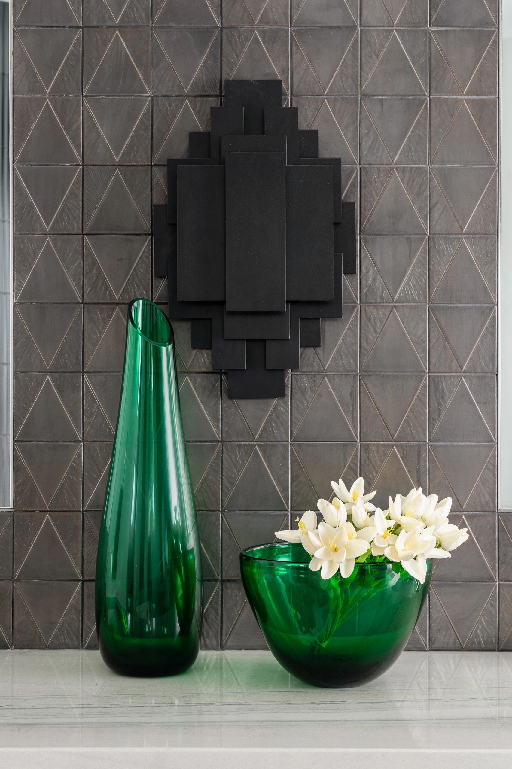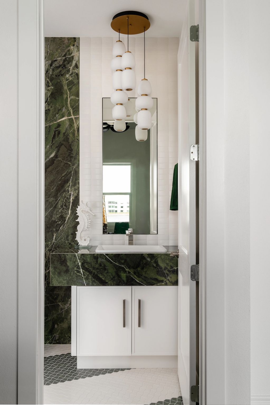 A green porcelain slab reminiscent of marble was combine with the 3D white tiles and used to build the contemporary countertop , contributing to achieve this fresh fun powder bath.