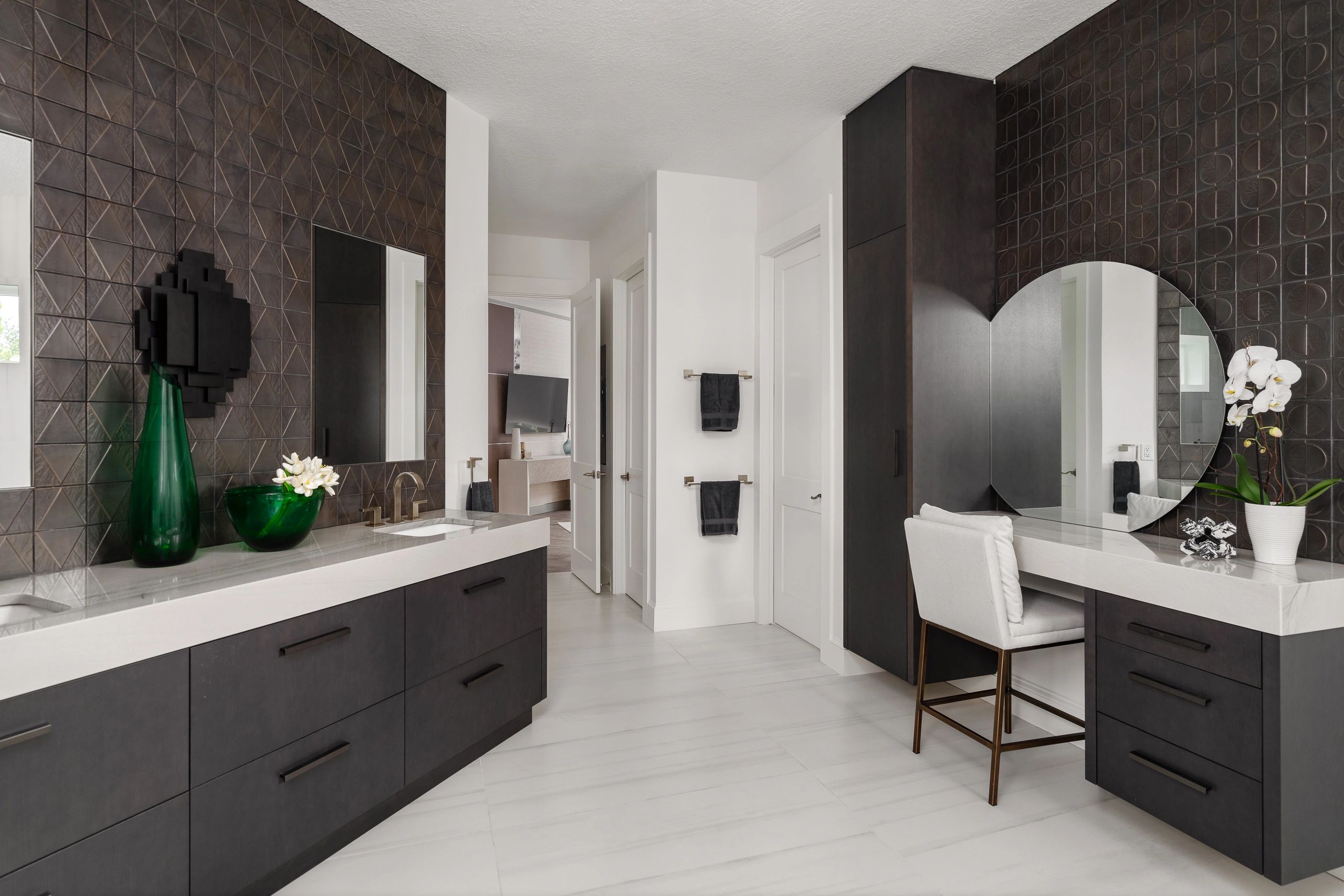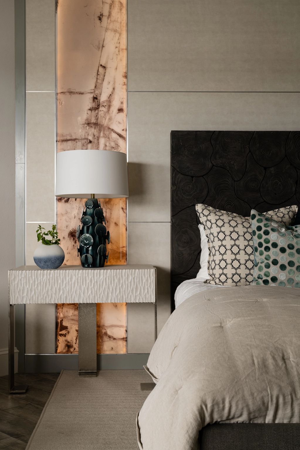For the master bedroom wall cladding we selected a combination of italian printed glass paired with warm leather in two tones.
