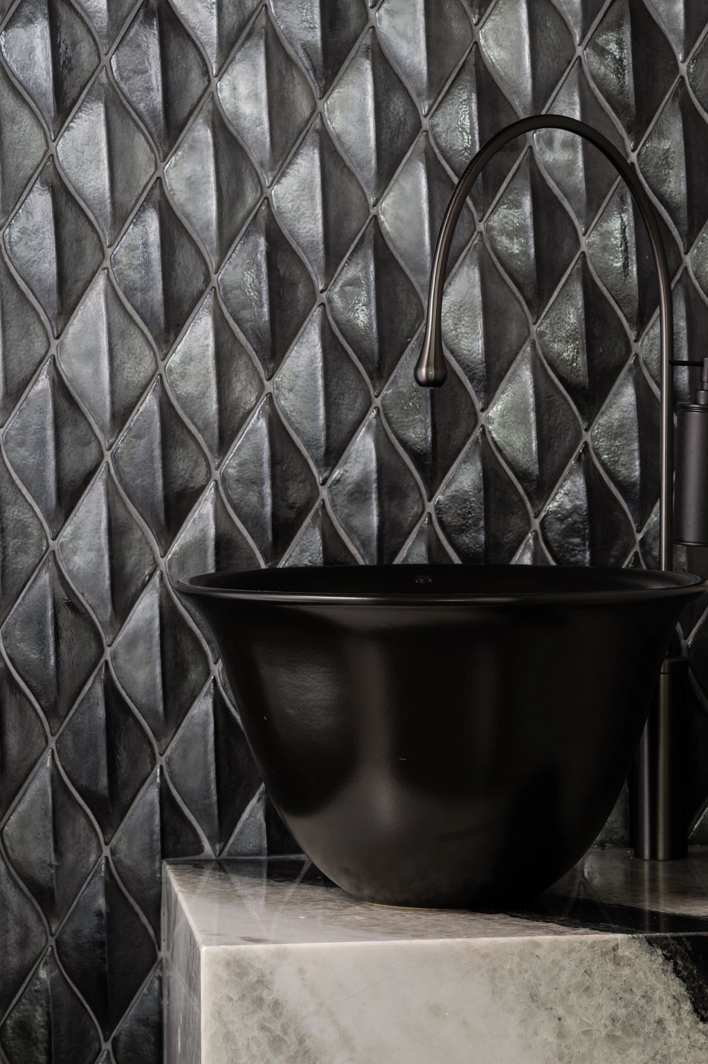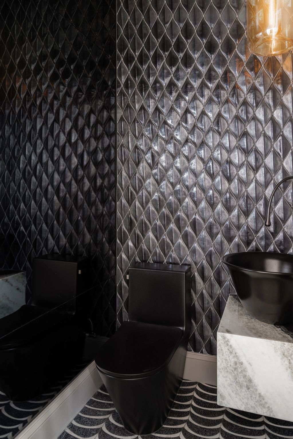 3D glass tile, a striking vessel sink, a modern faucet, a black and white marble floor, and a geometric marble countertop were chosen to create this moody and interesting powder bath.