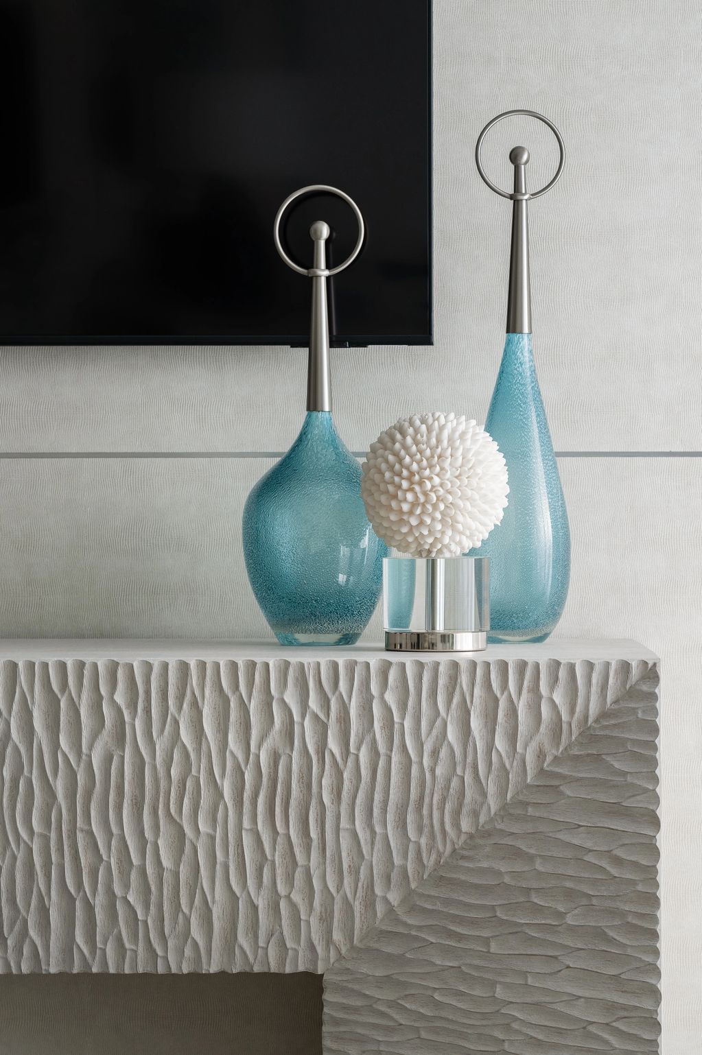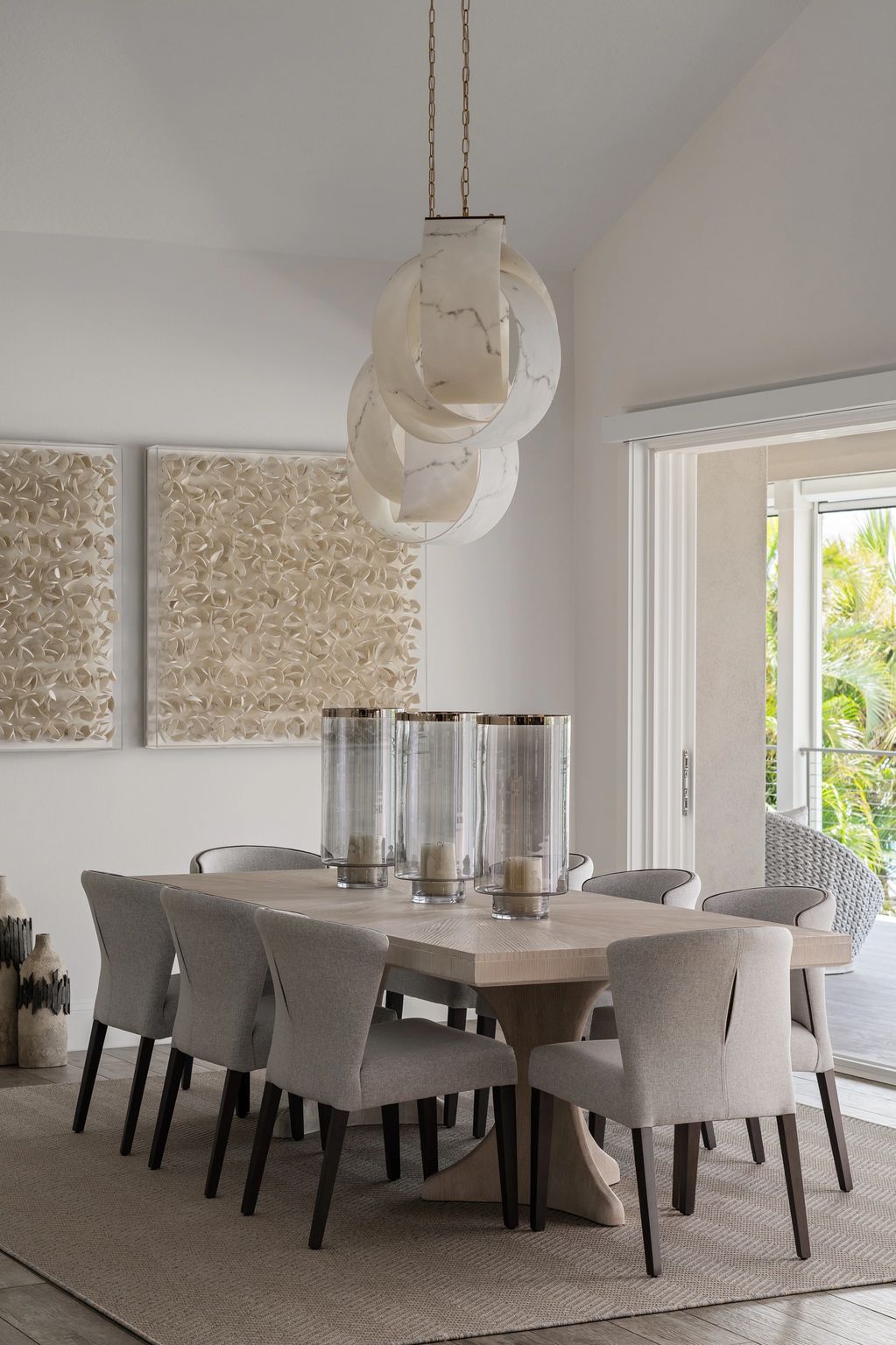 The pair of sculptural pendant lights in alabaster-look swirled forms add artistic flair and diffuse ambient lights that speaks with the magnificent glass candle holders.