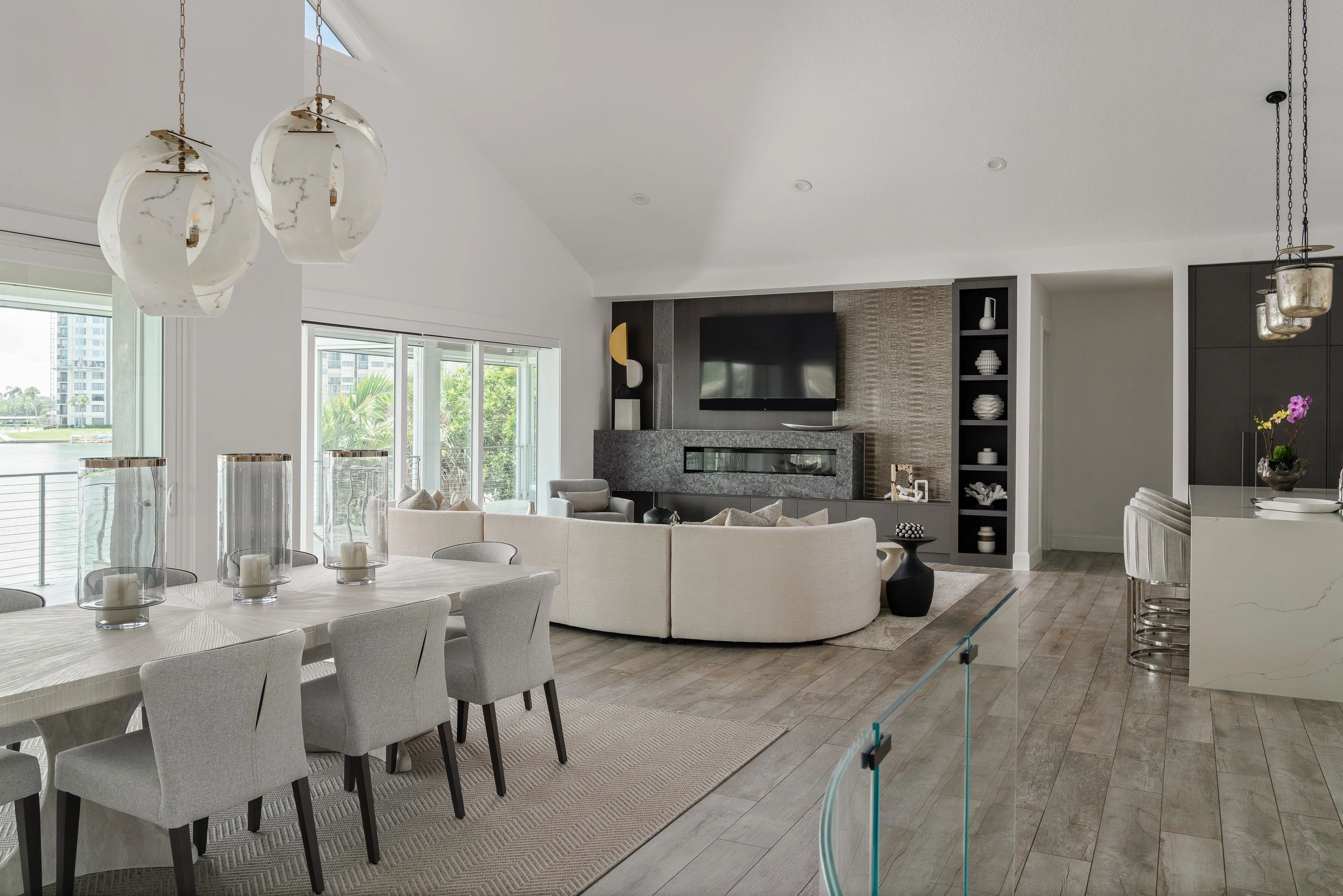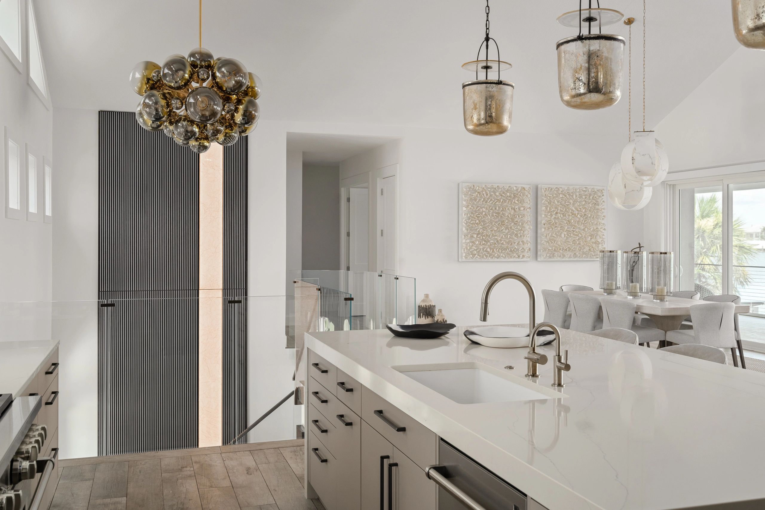 The kitchen is a masterclass in elevated coastal sophistication, blending modern lines with organic textures.