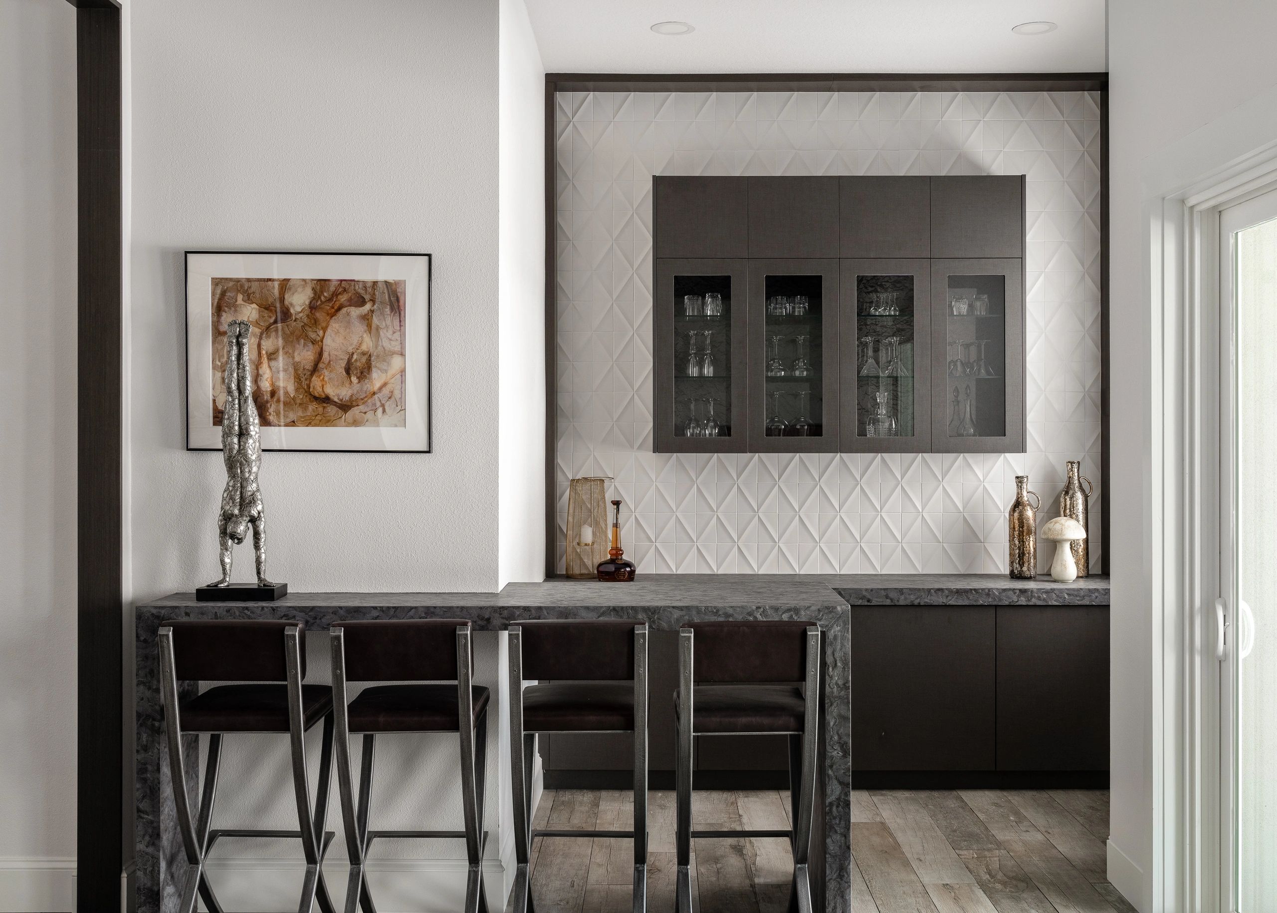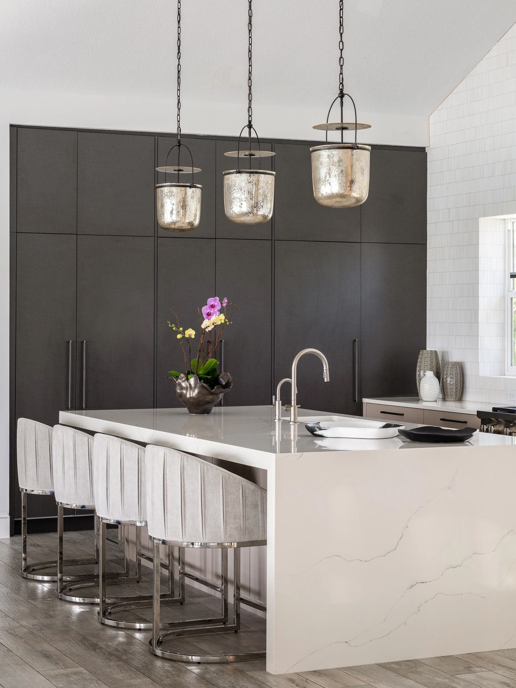 The polished chrome base, vertical channeling tailored countertop stools add a contemporary touch.