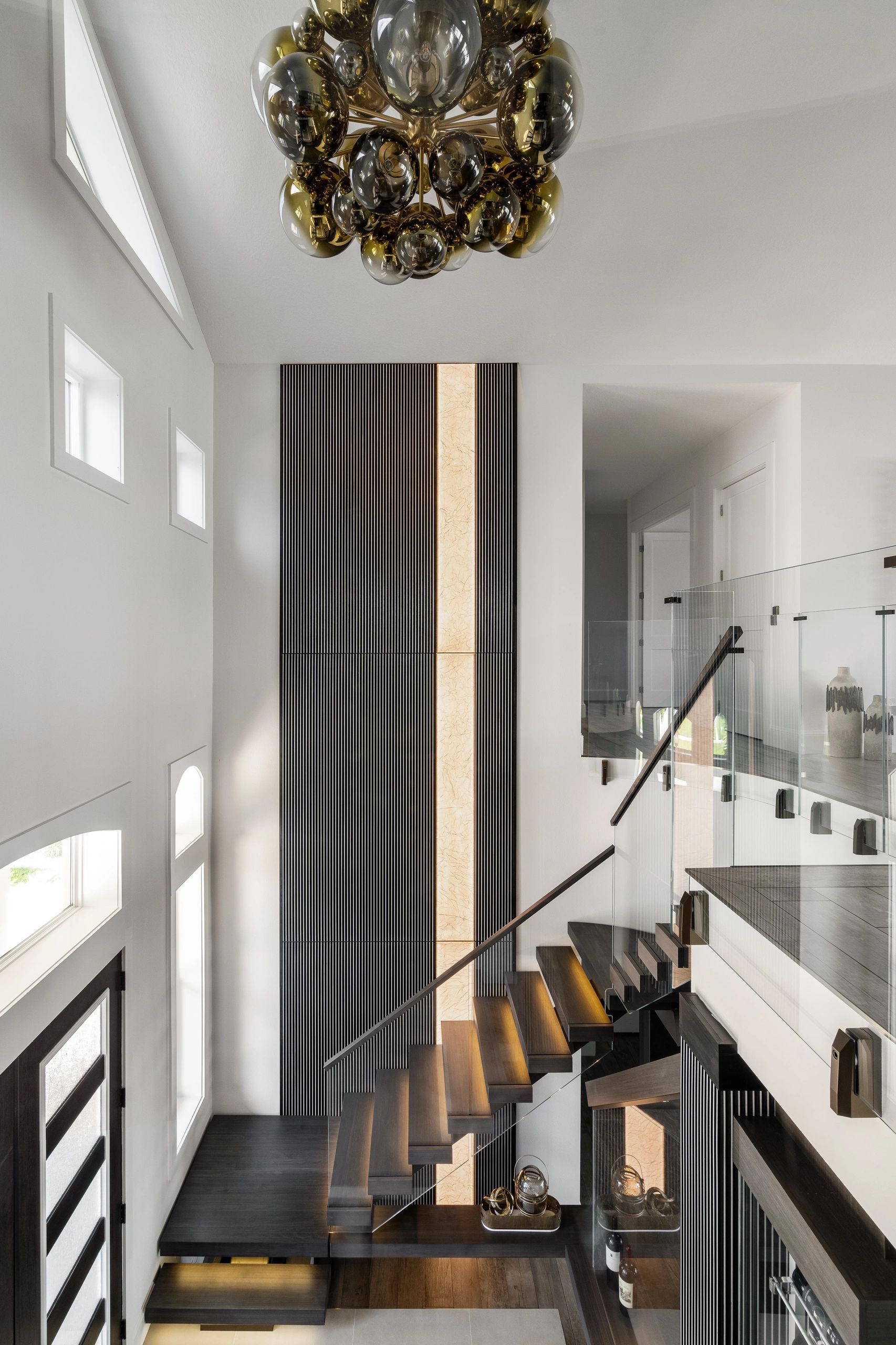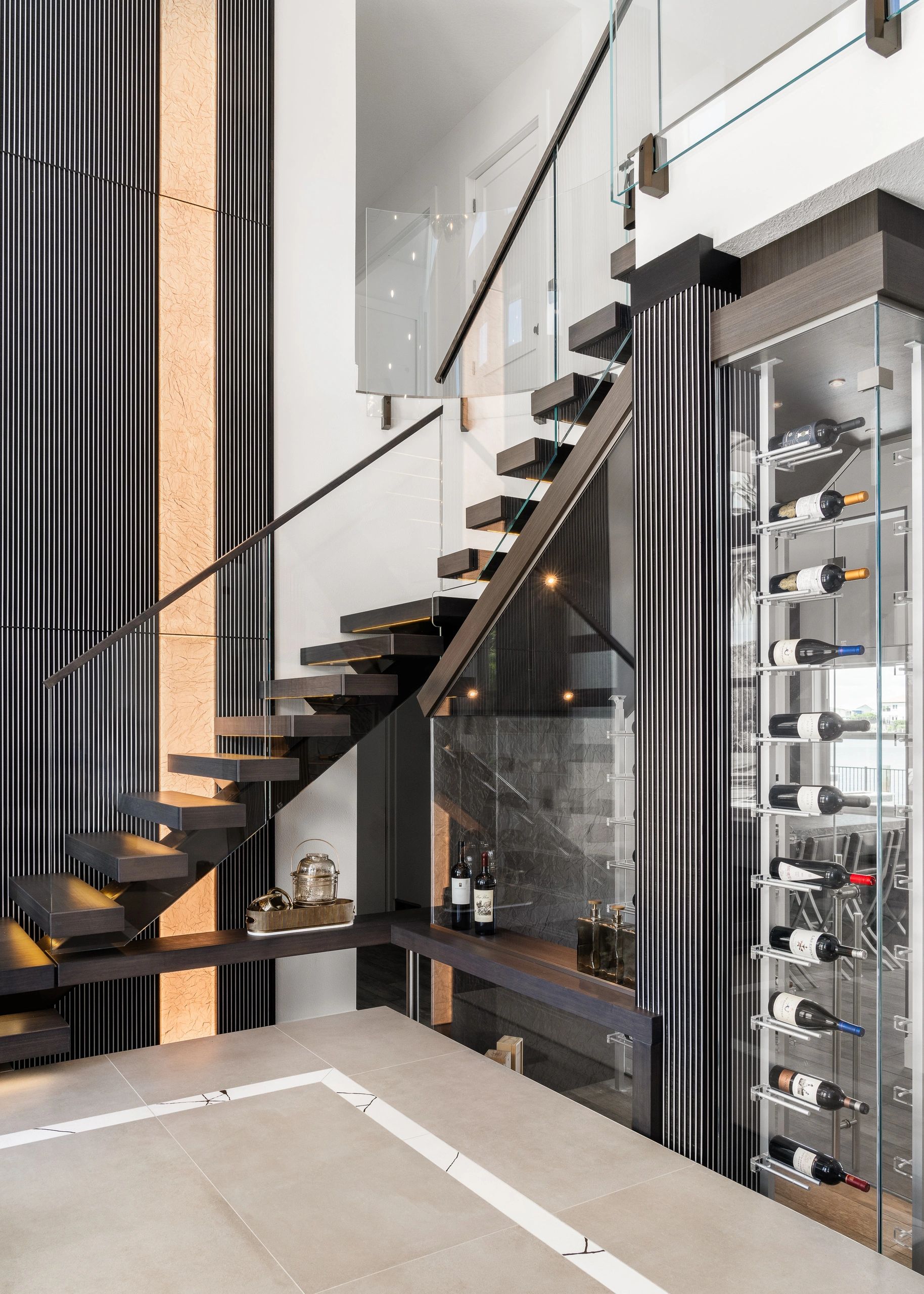 Through this modern and striking stair, the guest is invited to meet upstairs and enjoy a relaxed sophisticated social area, or stay downstairs for the ultimate entertaining experience.