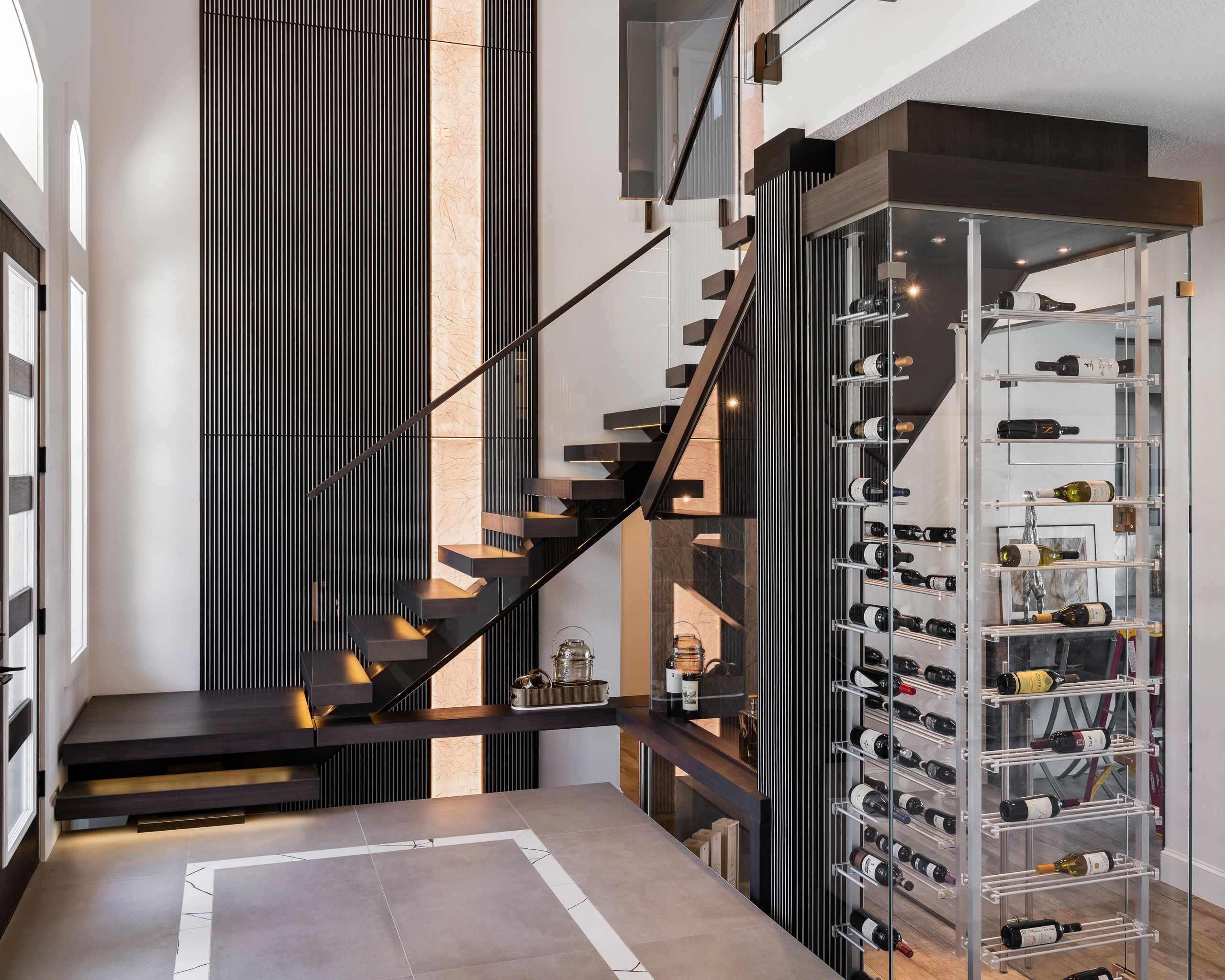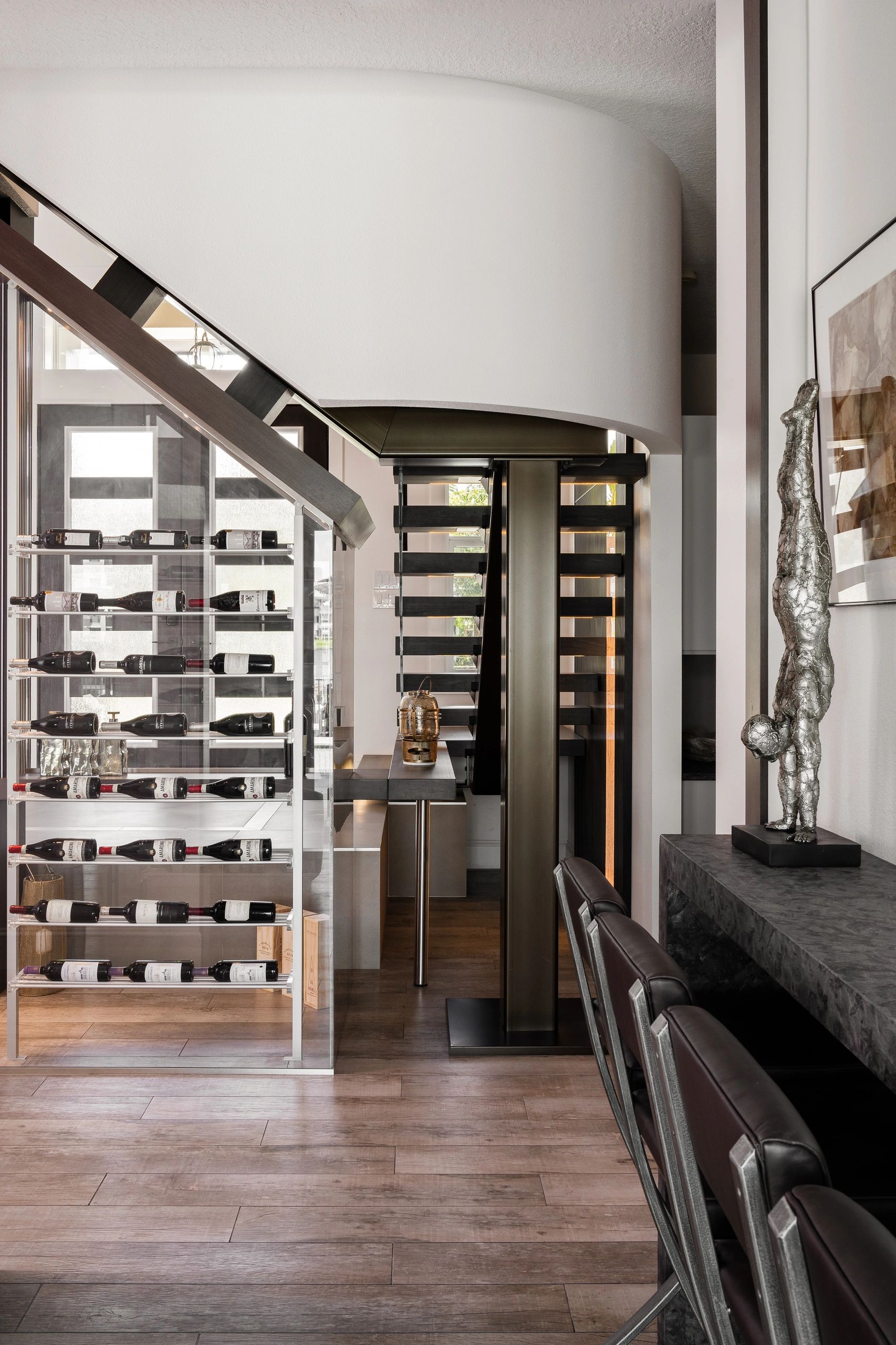 The amazing wine cellar sets the stage for ultimate entertainment, followed by a cool dining area and a bar .