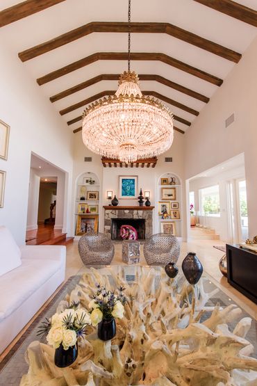 The immense stone fireplace  is framed by the customer's original art collection. A collection personally curated by the home owners that took many years to put together and  filled the room with culture and soul. .