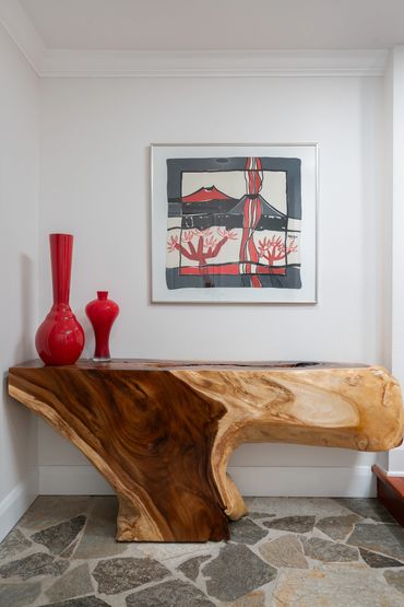 Complementary layers were added with a Turkish Kilim red rug and big pieces of striking modern art.