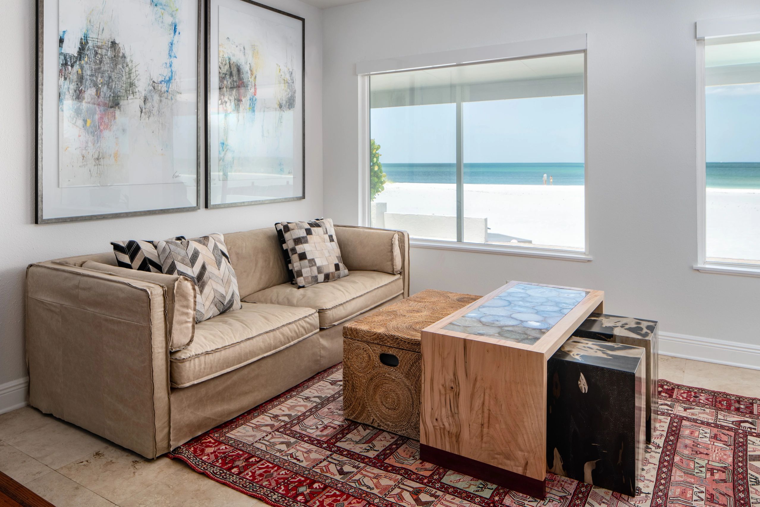 For the master suite, we created an elegant and chic heaven with a sense of style that is conductive to rest and relaxation. We selected a specific color combination by mixing the quietness of a soothing neutral pallet with the sophistication and elegance of a pop of color provided by the 2 hand woven silk and wool rugs from India, and an original oil painting acquired in Paris 40 year ago. The lounge seating area invites you to linger and enjoy the breathtaking vista of the Golf of Mexico. Sinking into these chaises allows you to carve out restorative moments, to unwind, unplug and recharge.