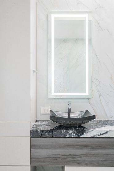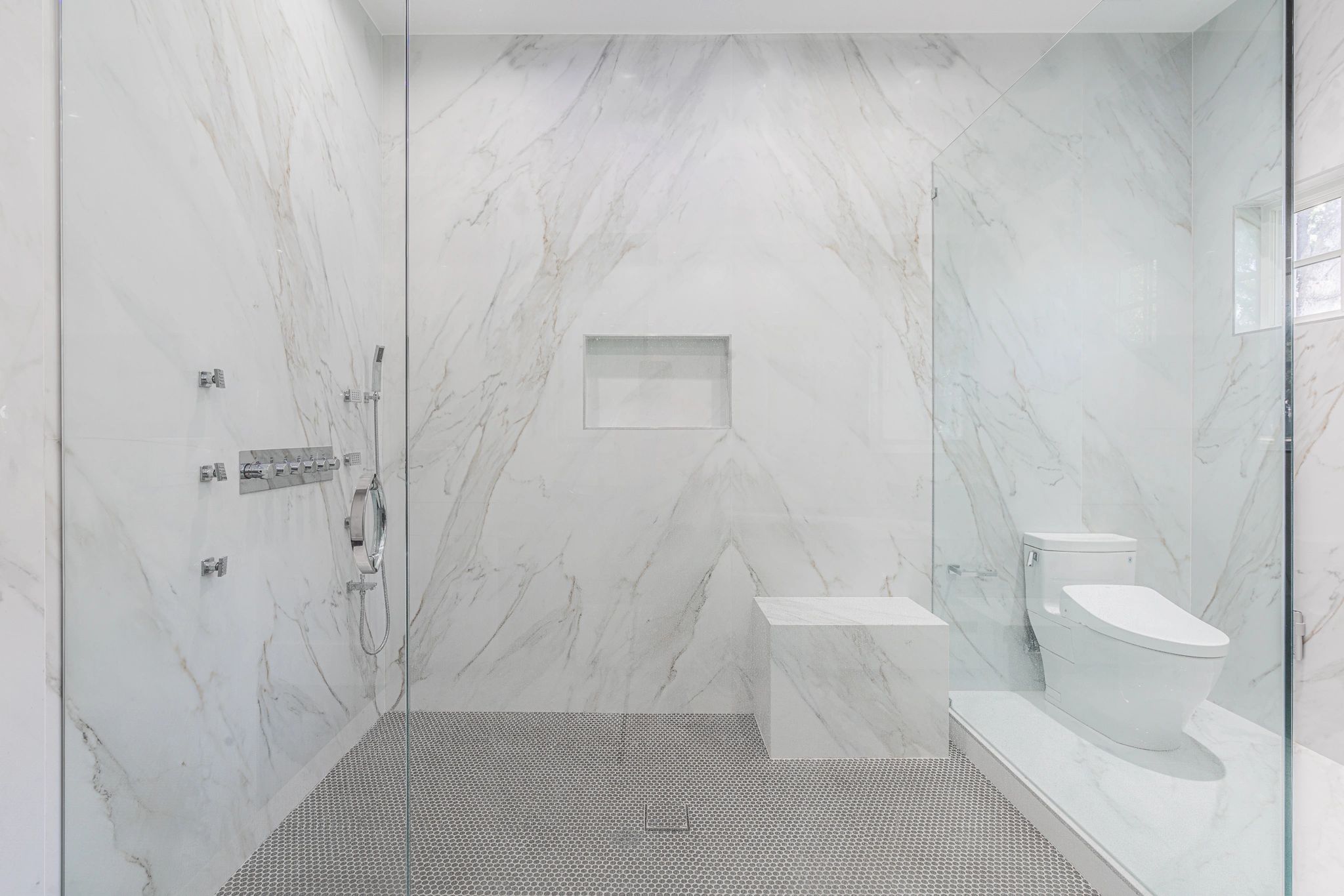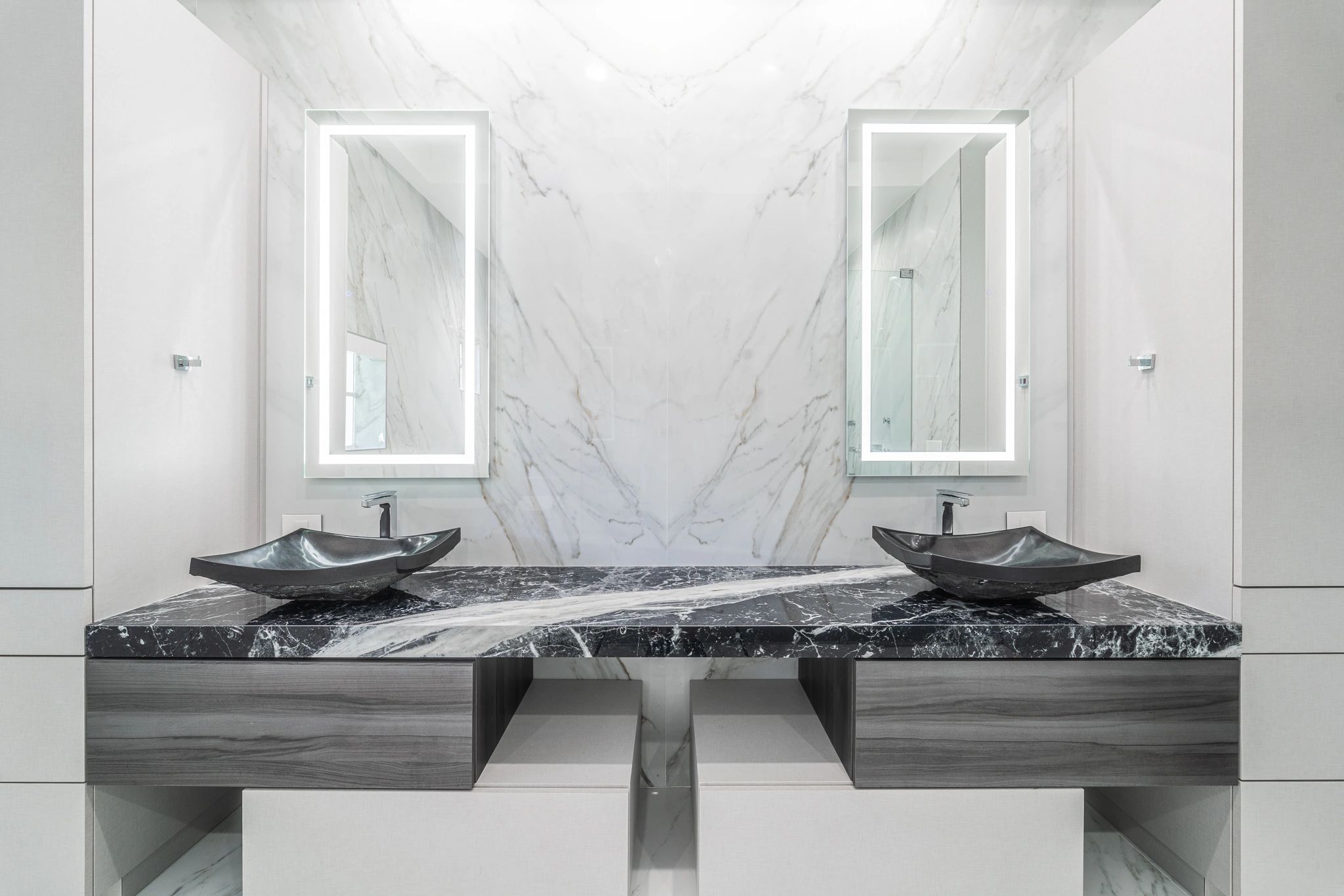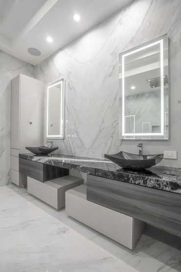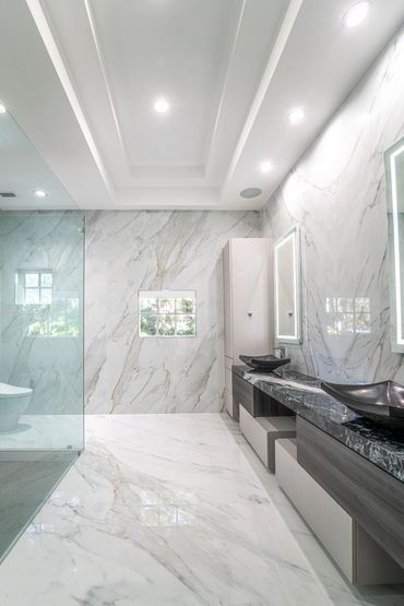 To create this grandiose bathroom we embraced the majestic look of marble but took advantage of modern materials by using large format porcelain slabs