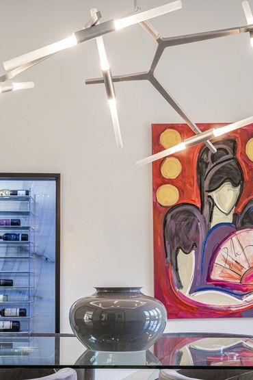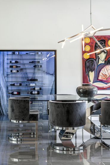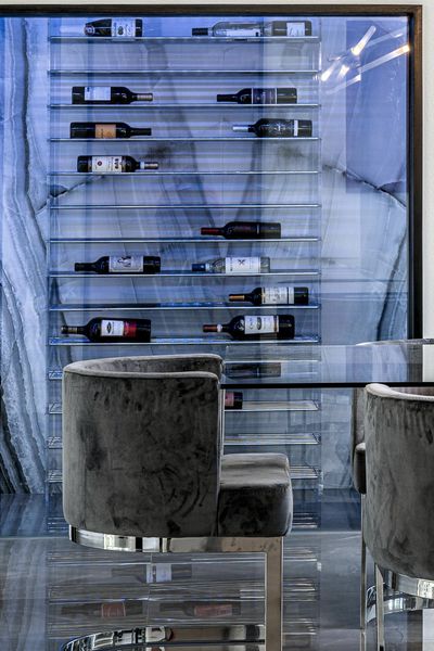 The wall below the stairs to the second floor was opened and enclosed with glass to create this elegant wine cellar. In the back wall a semi precious stone porcelain slab was installed and lighted with LED lights that change colors. The wine racks are made of lucite and stainless steel.