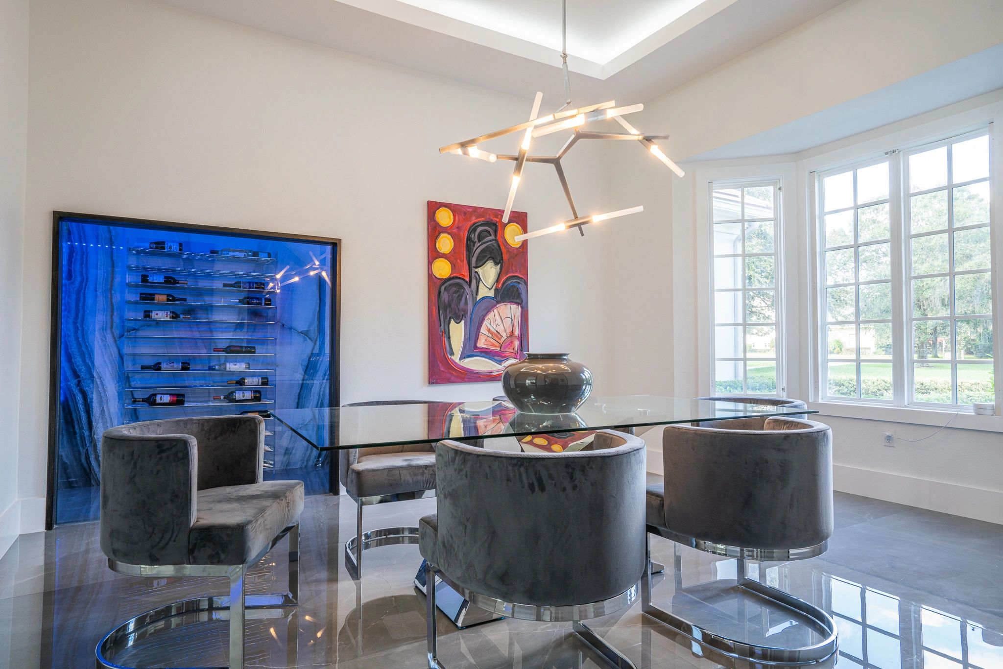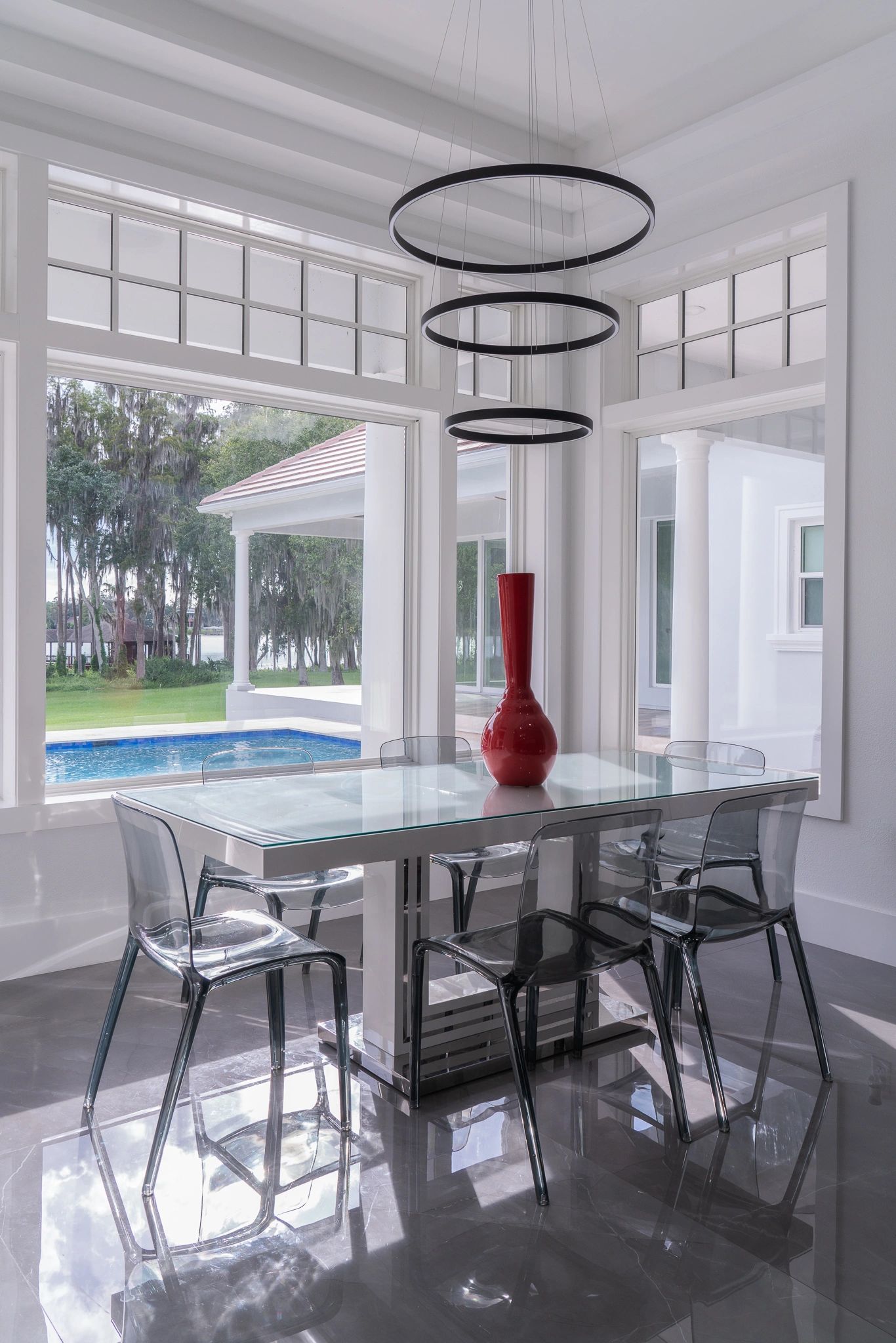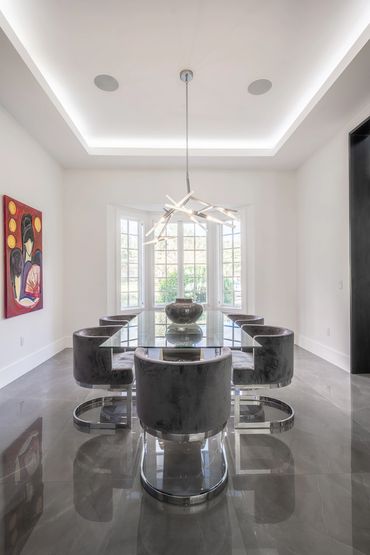 In the dining room, the sleek light glass table was paired with luxurious rich velvet chairs. We removed the molding from the ceiling and added a super modern chandelier and tray ceilings with LED lights. All these elements played together to create this spectacular dining room.