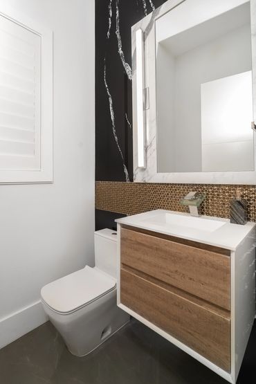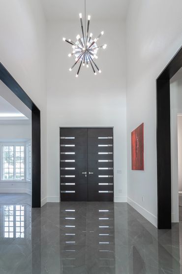 The sense of magnificence starts with the floors. 10Fx5F large format porcelain slabs in glossy grey were key to achieve the clean modern look. The openings were framed with espresso stained wood to add warmth and elegance and to serve as channels that harmonize the flow between the rooms.