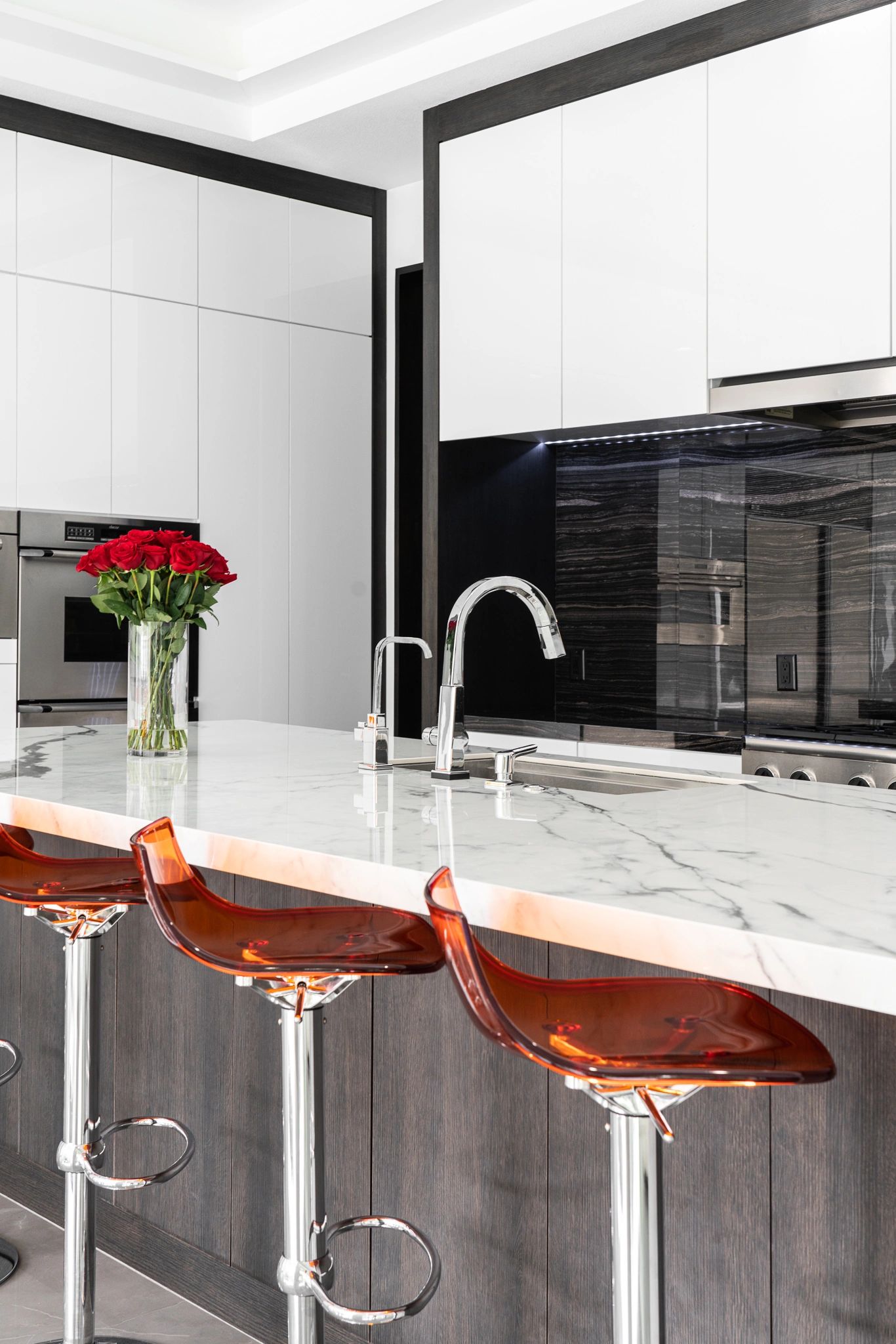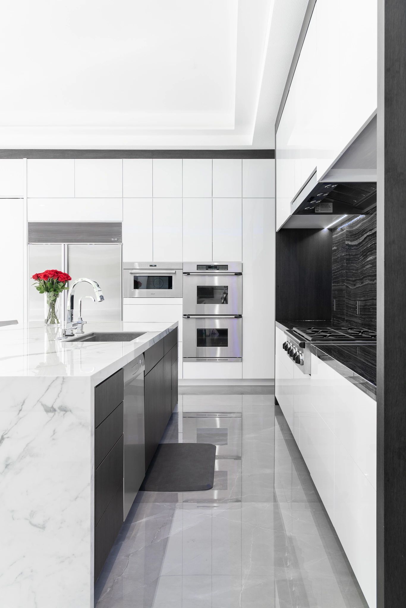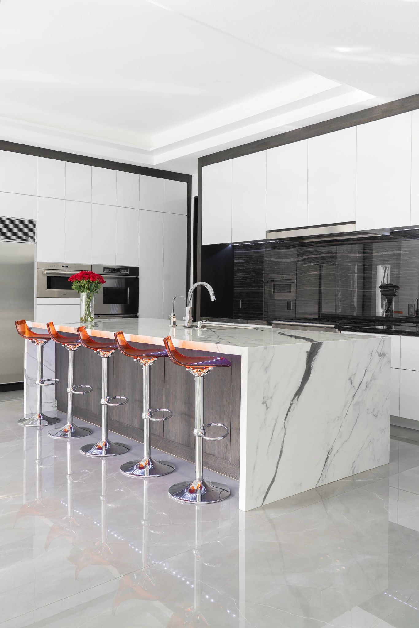 The high gloss white lacquered cabinets feature a sleek design eliminating the need for hardware. The island countertop and the kitchen backsplash are crafted from porcelain, a non porous, strong material that is easy to care and supports the active cooking style of the family.