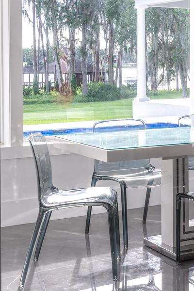 The acrylic counter stools and breakfast nook dining chairs bring a pop of color and fun to the family area.
