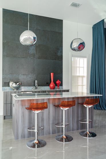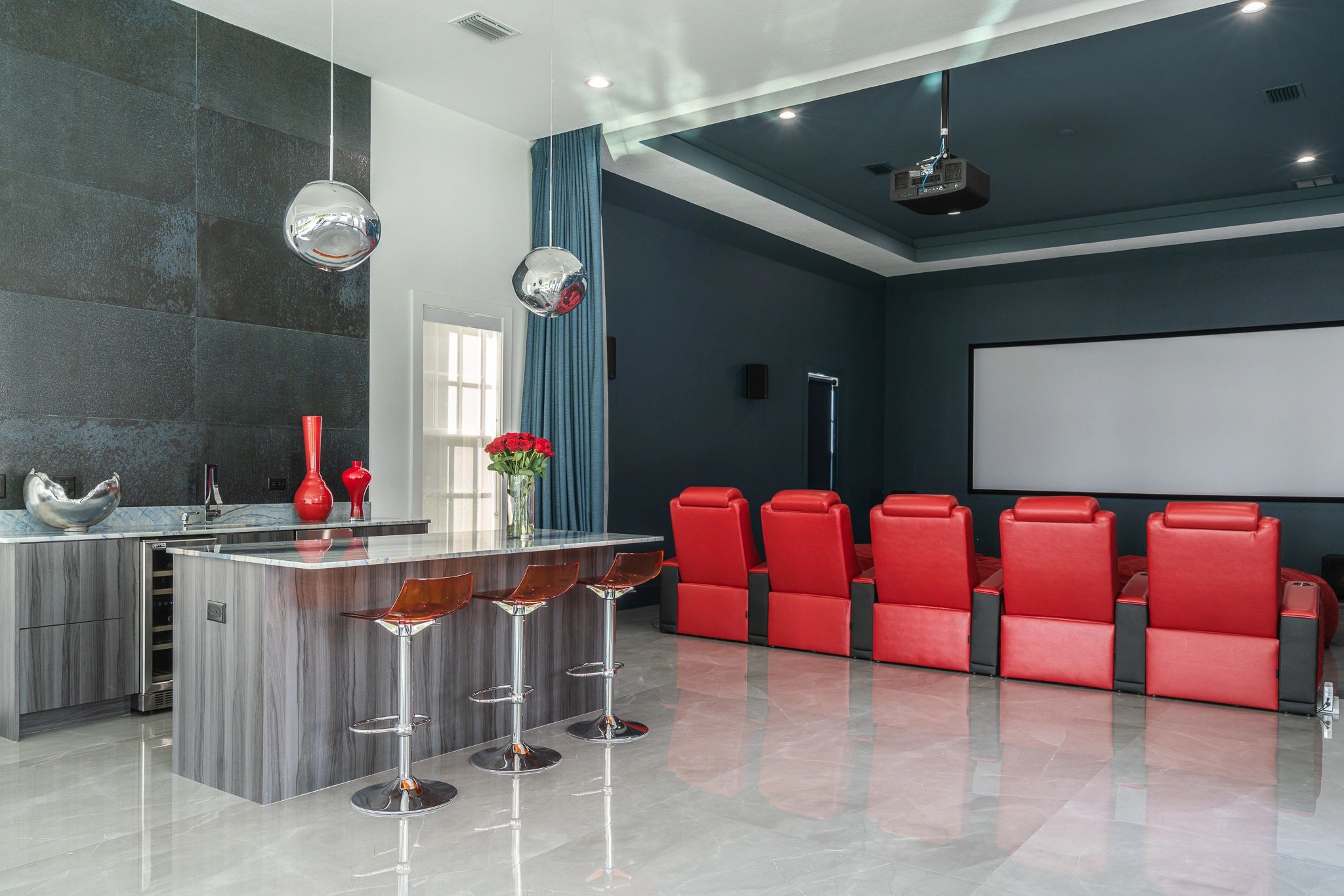 The color fantasy gets dreamier when you get to the movie theater and entertainment bar area. Red recliners chairs and big bean bags! . Tons of texture provided by the oxidized blue back splash, the blue countertop and the grey texturized cabinets are complemented by the pendant lights that resemble melted glass.